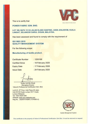 Archieved: Power Fabric is proud to announce the confirmation of our quality by the ISO 9001 Quality Management System Certification.