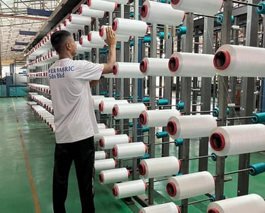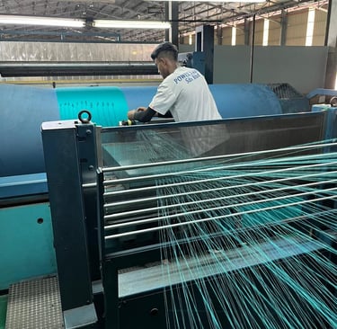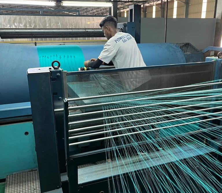 Warp and weft are the two basic components in weaving to transform thread and yarn into textile fabrics. The vertical warp yarns are held stationary in tension on a loom (frame) while the horizontal weft (also called the woof) is drawn through (inserted over and under) the warp thread. In the terminology of weaving, each warp thread is called a warp end; a pick is a single weft thread that crosses the warp thread. Warping refers to the process of arranging yarns or threads lengthwise on a loom. It ensures that the threads are properly aligned and tensioned before the weaving processes. After the draw in process, beams are moved to either Water Jet or Air Jet weaving machines depending on our production schedule.